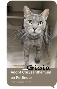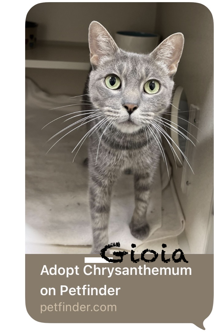 From the bottom of my heart, thank you for taking such good care of Gioia, formerly Chrysanthemum. She knows her name now! It’s been six months, and she has brought so much joy to me, her nana, and nearly everyone she meets. I am happy I trusted my heart after I fell for her in the picture you put on the website. Happy New Year from Gioia and me. We encourage the community to open their heart and homes to such wonderful animals. Grazie mille.