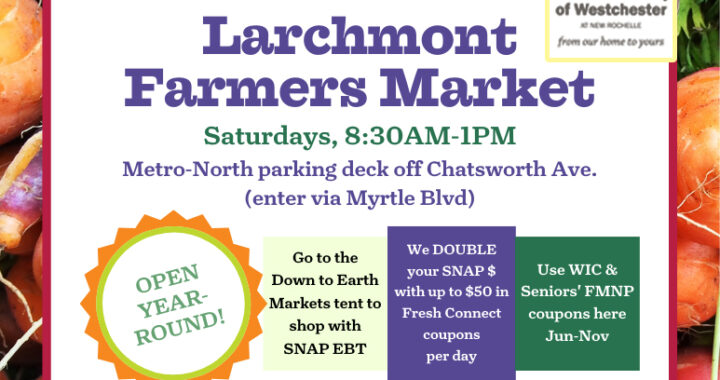 The Larchmont Farmers Market is located at the Metro North Upper Parking Deck at Chatsworth Avenue (entrance through Myrtle Boulevard)!