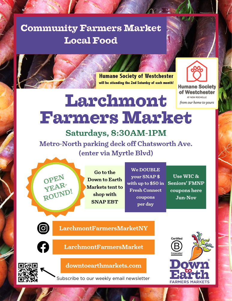 The Larchmont Farmers Market is located at the Metro North Upper Parking Deck at Chatsworth Avenue (entrance through Myrtle Boulevard)!